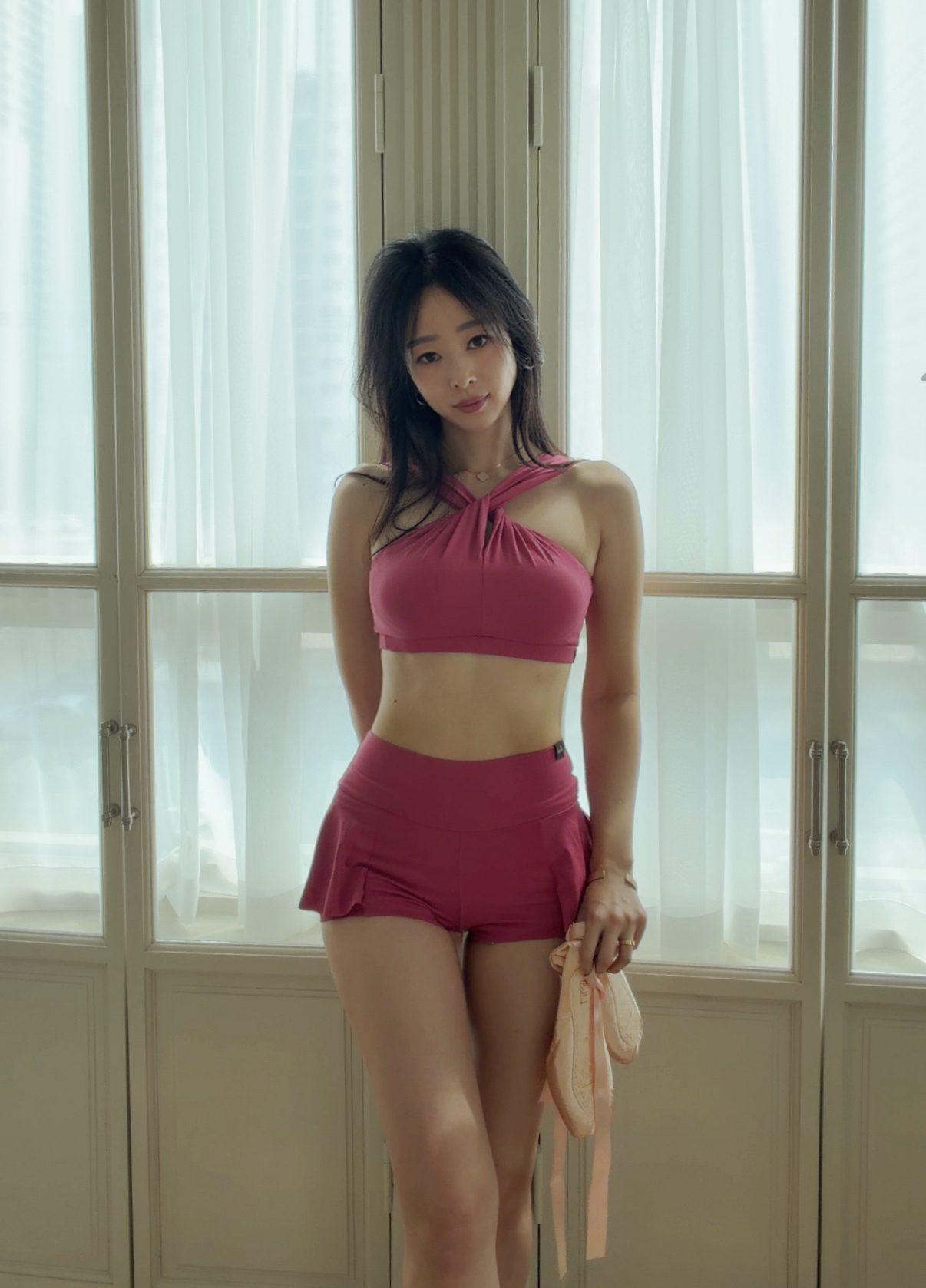 세련된 분위기의 핑크 컬러 폴웨어 세트입니다. 부드럽고 신축성 좋은 소재로 제작되어 몸에 편안하게 밀착되며, 활동 시에도 안정적인 착용감을 제공합니다. 크로스 홀터넥 디자인의 탑은 어깨와 쇄골 라인을 자연스럽게 강조해주고, 하이웨이스트 쇼츠는 허리를 잡아주면서 다리가 길어 보이는 실루엣을 연출해줍니다. 운동뿐 아니라 촬영이나 스타일링용으로도 활용하기 좋은, 여성스러움과 스포티함을 동시에 살린 아이템입니다. A stylish pink polewear set with a sleek and feminine vibe. Made from soft, stretchy fabric, it hugs the body comfortably while providing a secure fit during movement. The cross halter-neck top beautifully highlights the shoulders and collarbone, while the high-waisted shorts offer a flattering silhouette that elongates the legs. Perfect not only for workouts but also for photoshoots or styling, this set effortlessly combines femininity with a sporty edge. ✔️ Built-in bra pocket inside the top! Bra pads are not included. 브라패드는 제공되지 않습니다.